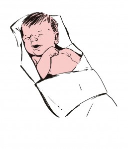 Po porodu otřeme novorozence přiloženými rouškami z měkké, bílé netkané textilie.