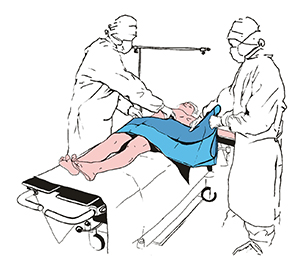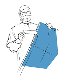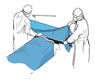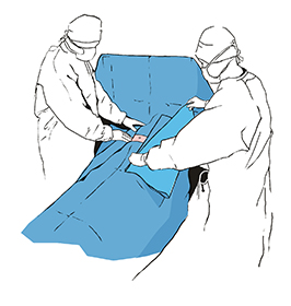 Upevníme roušku na tělo pacienta a roztáhneme ji ve směru šipek, čímž vymezíme spodní hranici operační pole. Zbývající část roušky roztáhneme na nohy.