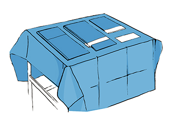 Po otevření obalu položíme rouškování na pomocný stolek. Vnější rouškou přikryjeme stolek a ostatní prvky. Rozložíme obsah balení na stolek, věnujeme pozornost piktogramům na rouškách označujícím místo jejich použití.